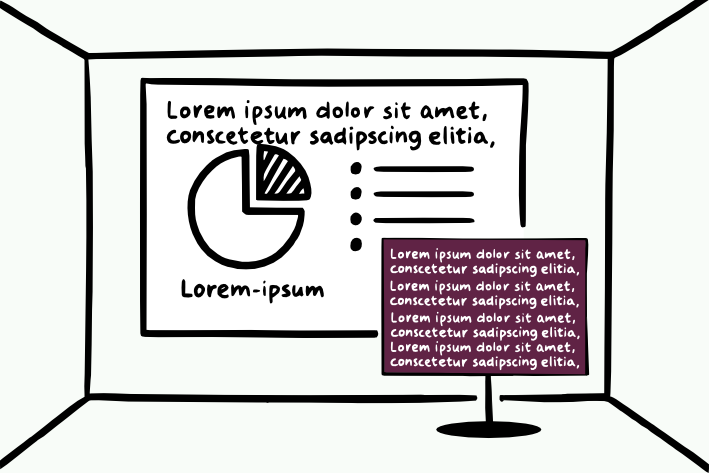 Die klassische Variante: Sie haben einen Beamer und eine Leinwand für Ihre Präsentation und stellen zusätzlich entweder einen zweiten Beamer mit Leinwand (bzw. einer weißen Wand neben der Präsentations-Leinwand) oder ein, zwei, viele Groß-Display(s) auf.